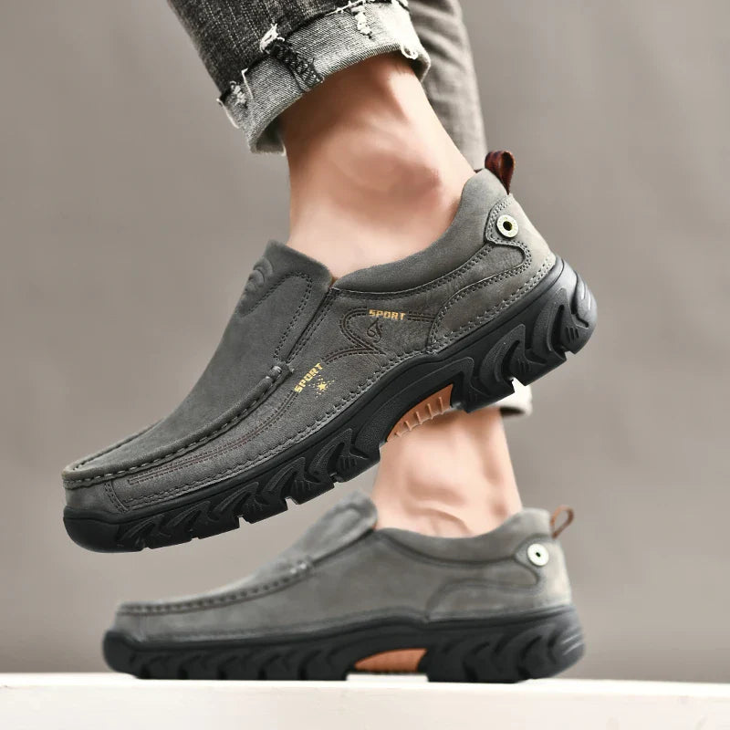 Genuine leather elevates a stylish slip-on shoe designed with comfortable cushioning and a grippy sawtooth rubber sole for enhanced traction.