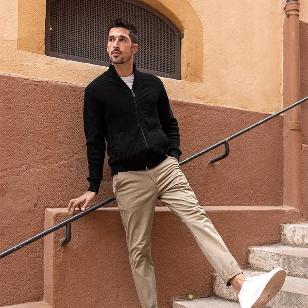 Modern men’s fashion banner featuring a well-dressed male model in casual-smart attire, neutral colour palette, minimalist background, clean and professional ecommerce style, soft studio lighting, contemporary UK fashion brand aesthetic, spacious composition with room for text overlay